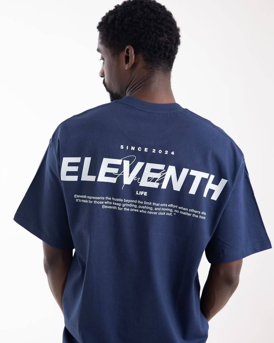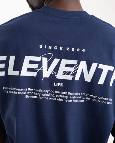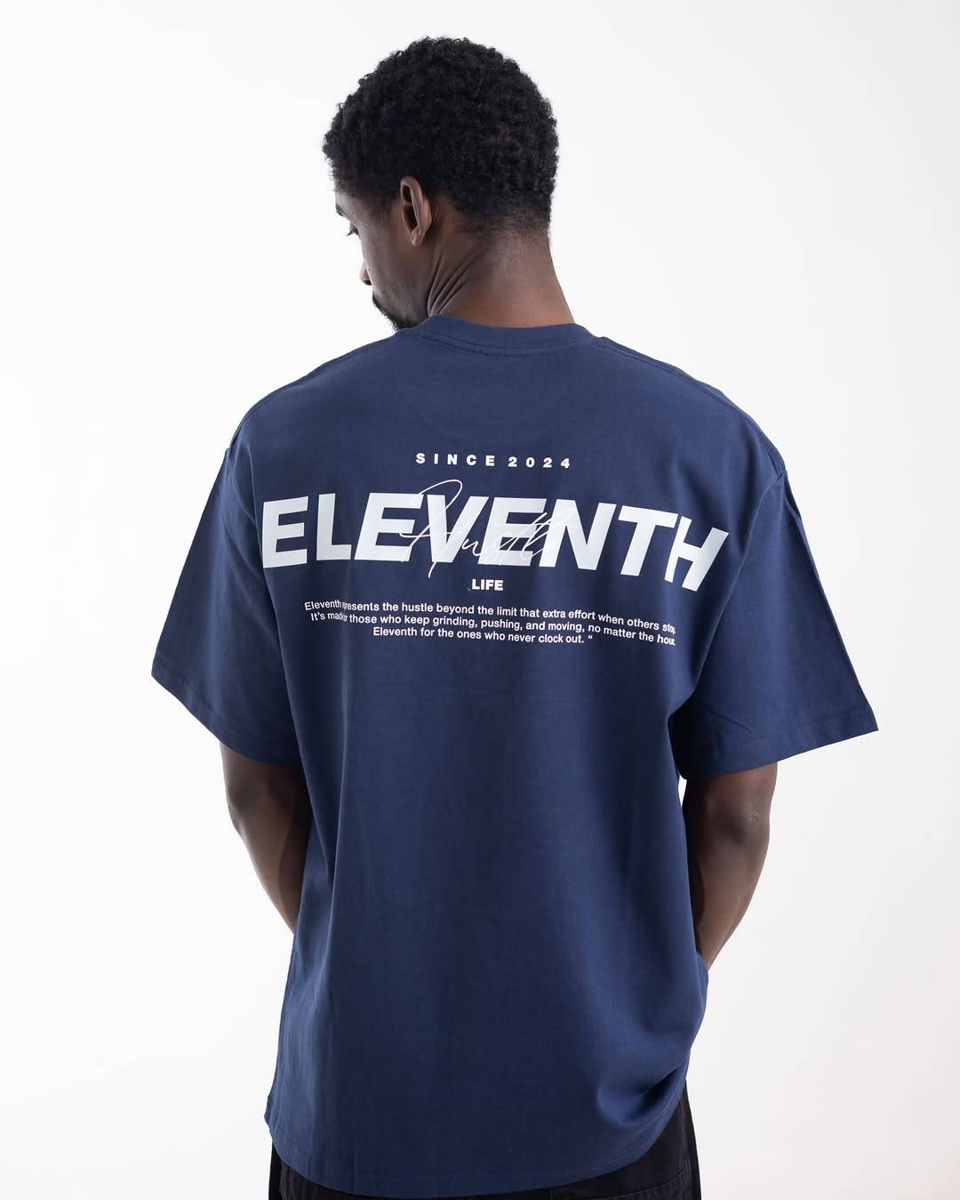 The official 2024 "Manifesto" tee from Eleventh. This oversized navy shirt defines the brand. The back graphic lays out the core mission: "Eleventh represents the hustle beyond the limit... for the ones who never clock out." This is the uniform for the grind.