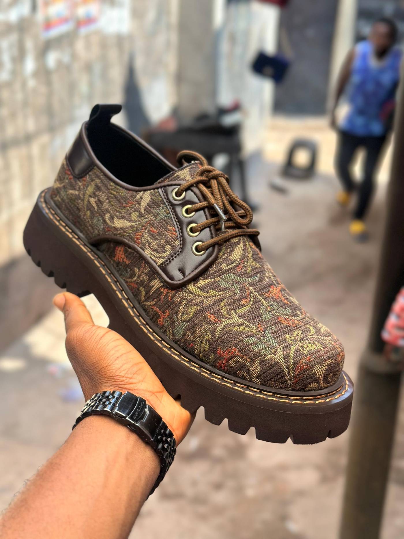 Make a bold statement with these distinct Vintage Tapestry Chunky Derbys, blending classic aesthetics with modern streetwear edge. The upper is constructed from a premium, heavy-weight jacquard fabric featuring an intricate, woven floral pattern in rich earth tones of moss green, rust, and brown. This textured textile is framed by smooth, dark brown leather overlays on the eyestay and collar for structural contrast. Sitting atop an aggressive, chunky lugged platform sole, this shoe offers commanding height and rugged durability. Finished with robust rope laces and brass metal eyelets, this pair delivers a unique fusion of artisanal craft and contemporary fashion, perfect for elevating any casual outfit.